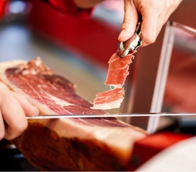 Impresiona a tus invitados con la destreza de nuestro maestro jamonero, quien corta y sirve el mejor jamón ibérico con gran habilidad.
